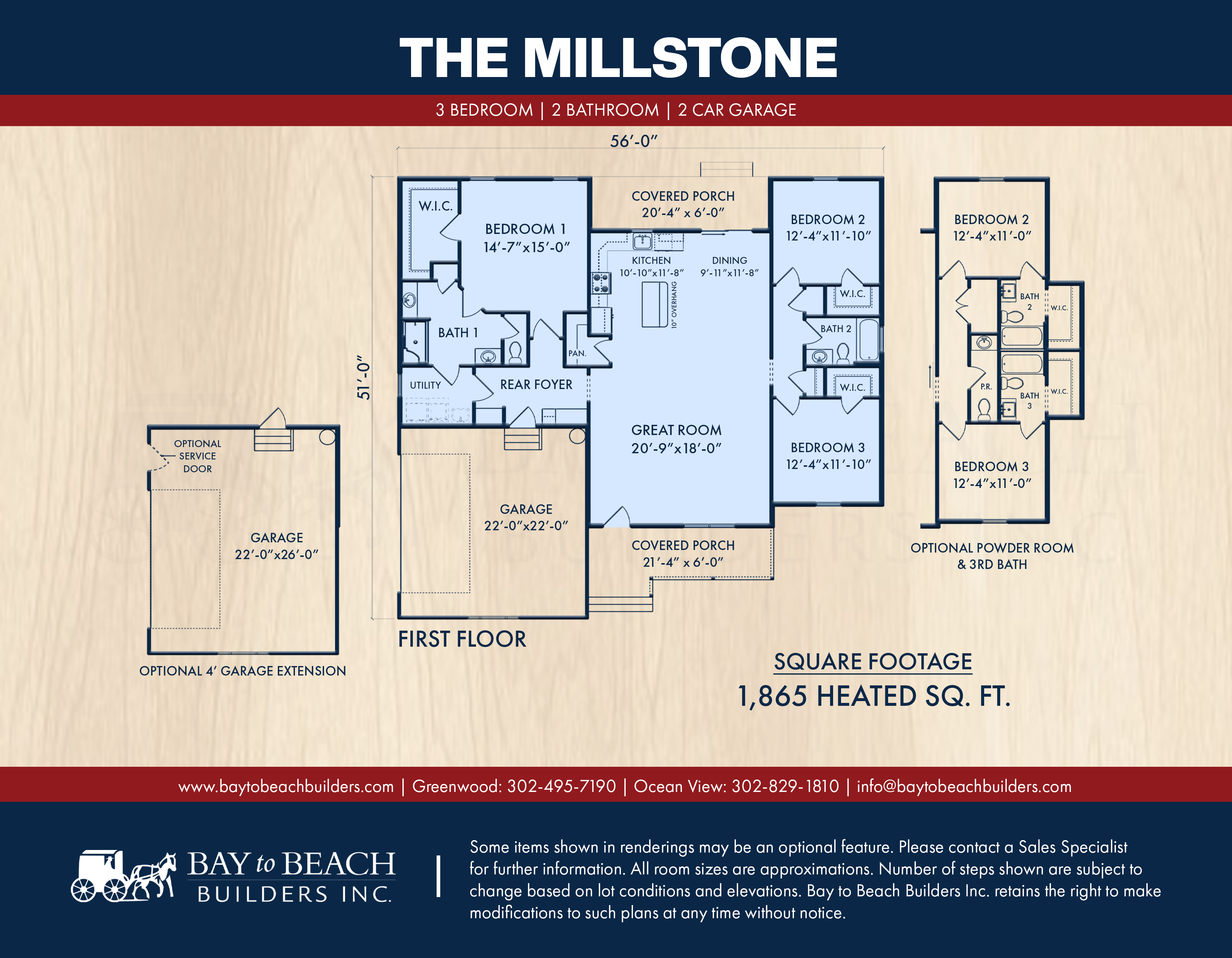 The Millstone also includes a convenient rear foyer with a laundry area and access to the two-car garage. Optional garage extensions provide additional storage or workspace for hobbies and projects. For those who love outdoor living, the home offers two covered porch options, allowing you to enjoy the fresh air and scenic surroundings.