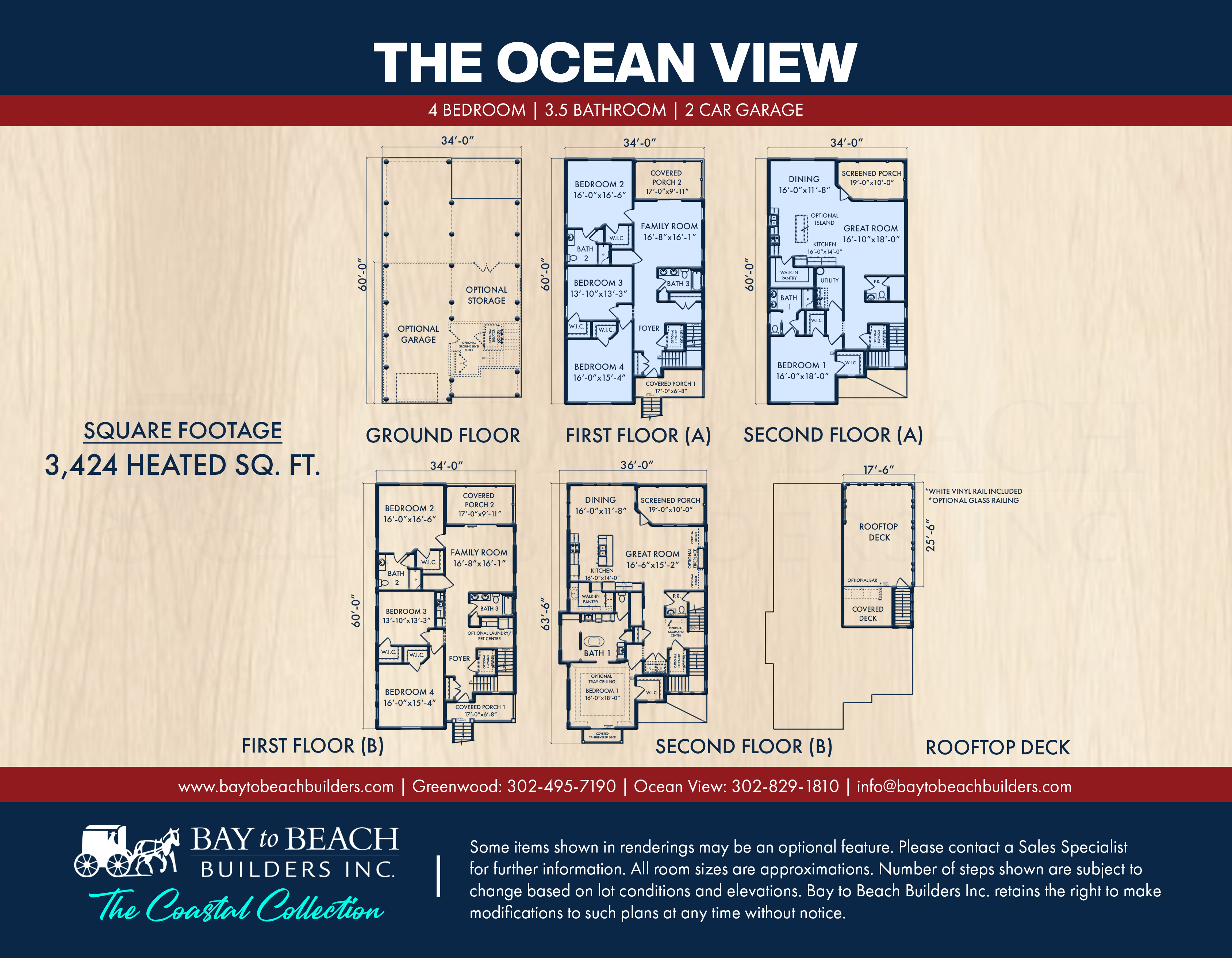 The flagship design of our Coastal Collection, the Ocean View is the ultimate expression of elegant beach living—designed to capture panoramic views, indoor-outdoor flow, and the refined comfort today’s coastal buyers are searching for. With 3,424 heated square feet, 4 bedrooms, 3.5 bathrooms, a 2-car garage, and multiple outdoor living spaces including a rooftop deck, this plan delivers a one-of-a-kind lifestyle experience that’s ideal for Delaware beach communities like Ocean View, Bethany Beach, Fenwick Island, and Rehoboth.